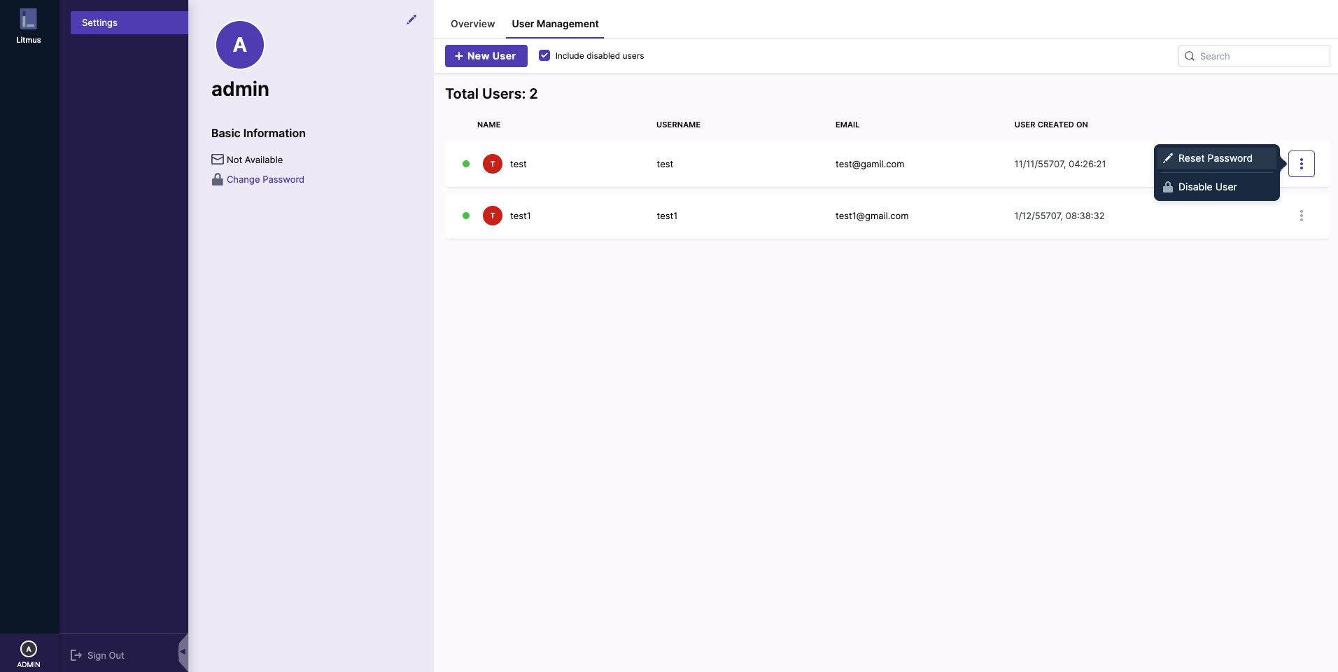 Under the User Management tab find the user who's password needs to be updated and click on the options icon to open a drop-down and select Reset Password option